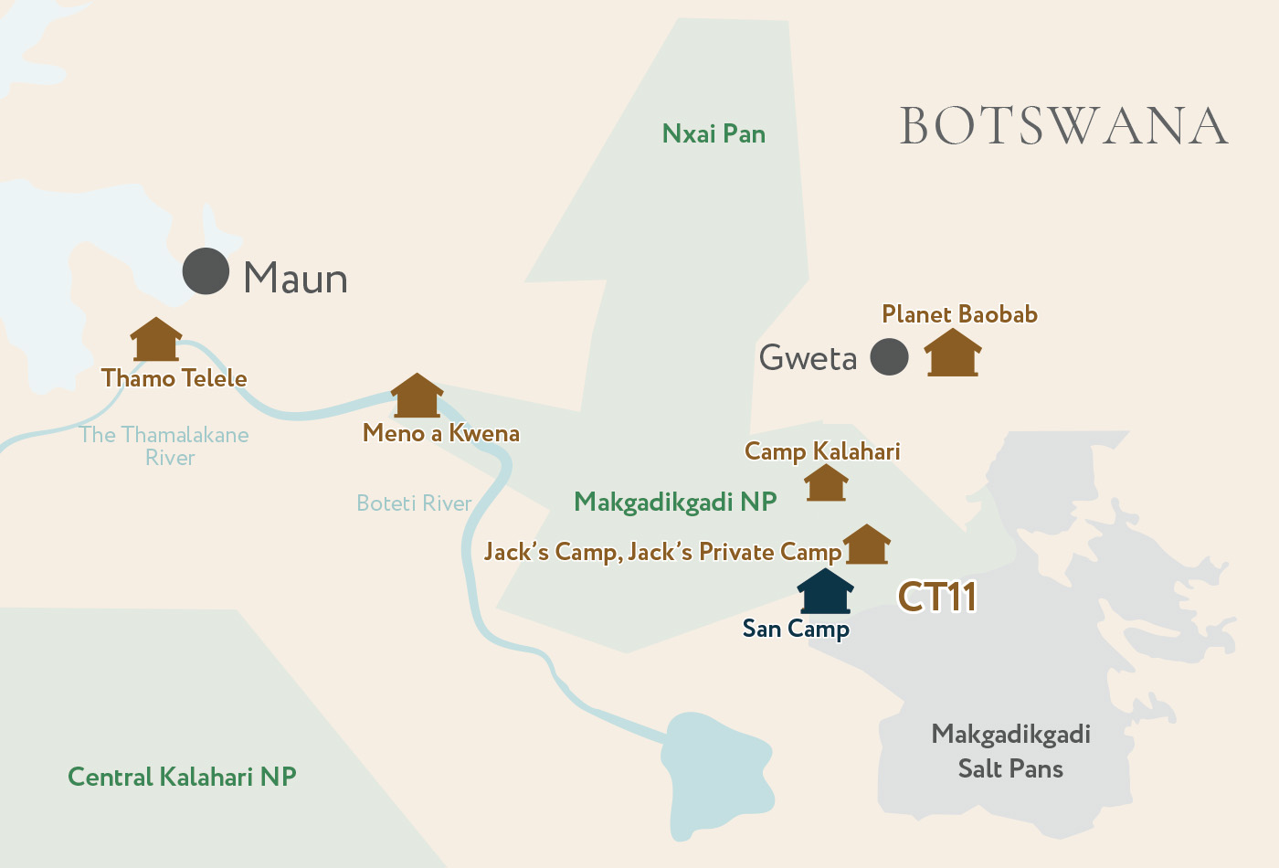 "Ce petit camp est en quelque sorte le petit frère jumeau de Jack's Camp. Moins luxueux, il offre une expérience de la brousse qui reste incroyable. Comme chez Jack, les tentes sont dépourvues d'électricité, ainsi il faut commander une douche chaude à l'avance. Le personnel chauffera de l'eau sur le feu et en remplira votre seau. Les deux camps sont riches de guides naturalistes très pointus, collaborant notamment à plusieurs sujets de recherche. Uncharted Africa Safaris propose des safaris mobiles sur plusieurs nuits mais aussi huit jours d'initiation à la chasse avec les Bushmens !"