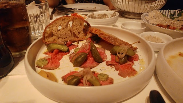 "Dans cet immeuble, vous trouverez deux niveaux pour une même ambiance exclusive : un bar lounge occupe le rez-de-chaussée tandis qu’un restaurant ultra-raffiné se trouve à l’étage. Demandez à être installés upstairs et profitez d’un voyage culinaire original, représentatif de la scène gastronomique israélienne : délibérément méditerranéen, archi précis, avec quelques (bonnes) surprises. Si pendant un court instant on se croirait à New York, pas de doute, nous sommes bien à Tel Aviv dans l’assiette. Possibilité de réserver en ligne."