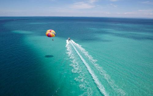 "Pilotis sur l’eau avec piscine. Du bleu, du bleu, du bleu... Attention le portefeuille par contre !"